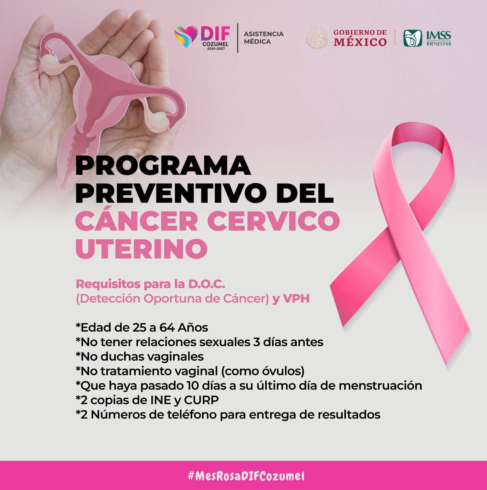 Cozumel, Quintana Roo, a 24 de septiembre de 2025.- La Presidenta Honoraria del Sistema DIF Cozumel, Diana Sosa Blanco, dio a conocer que los días 02, 03 y 17 de octubre se llevará a cabo el Programa Preventivo de Cáncer Cérvico Uterino y VPH, en coordinación con el IMSS Bienestar, como parte de las acciones del Gobierno que encabeza el Presidente Municipal José Luis Chacón.