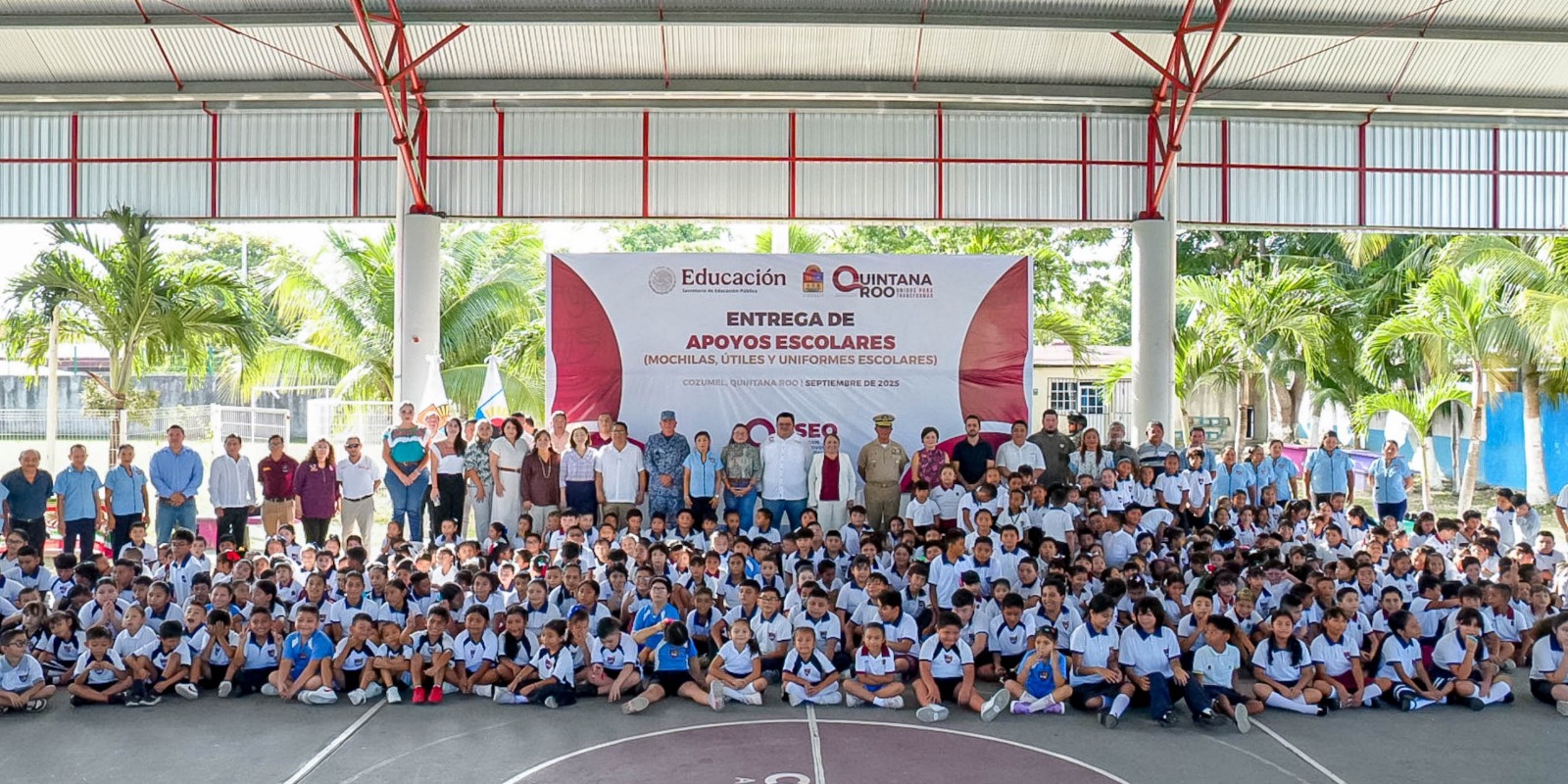 Cozumel, Quintana Roo, 03 de septiembre de 2025. – La Presidenta Honoraria del Sistema DIF Cozumel, Diana Sosa, acompañó al presidente municipal José Luis Chacón durante la Ceremonia de entrega de apoyos escolares 2025-2026 y de libros de texto gratuitos, realizada en la primaria Juan de Grijalva y organizada por la Secretaría de Educación.