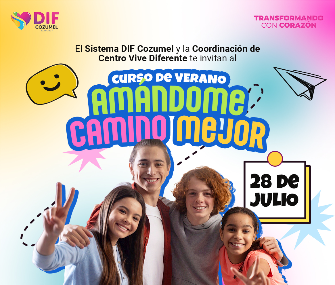 Cozumel, Quintana Roo, a 16 de julio de 2025. – Como parte del compromiso con el bienestar emocional y el desarrollo integral de las juventudes, la presidenta honoraria del Sistema DIF Cozumel, Diana Sosa Blanco, invita a las y los adolescentes de la isla a participar en el curso de verano “Amándome camino mejor”, organizado a través de la Coordinación de Centro Vive Diferente.