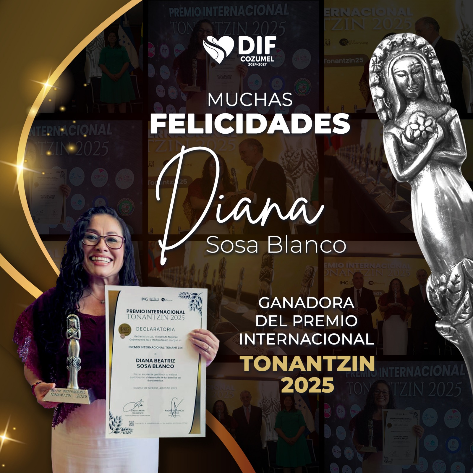 Cozumel, Quintana Roo a 11 de agosto de 2025.– La Presidenta Honoraria del Sistema DIF Cozumel, Diana Sosa Blanco, fue reconocida con el Premio Internacional Tonantzin 2025, otorgado por el Instituto Mejores Gobernantes A.C. y Red Gobierno, distinción que celebra el trabajo y compromiso con las familias de México e Iberoamérica.