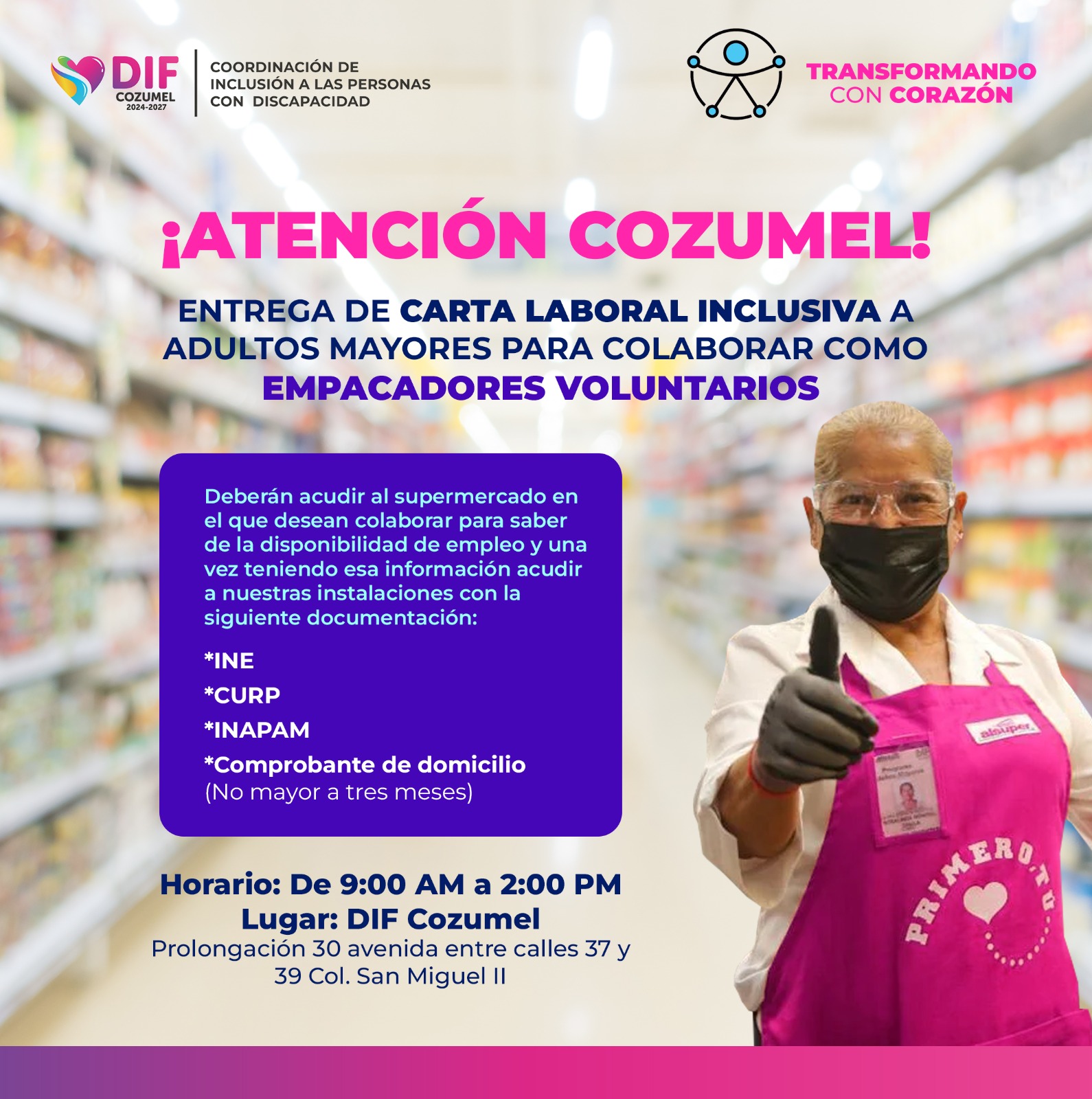 Cozumel, Quintana Roo, a 15 de diciembre de 2025.– Con el compromiso de fomentar un modelo económico más justo, incluyente y competitivo, el Gobierno Municipal que encabeza José Luis Chacón, junto al Sistema DIF Cozumel que preside Diana Sosa Blanco, a través de la Coordinación de Inclusión, pone a disposición de las personas adultas mayores la Carta Laboral Inclusiva para colaborar como empacadores voluntarios en supermercados de la isla.