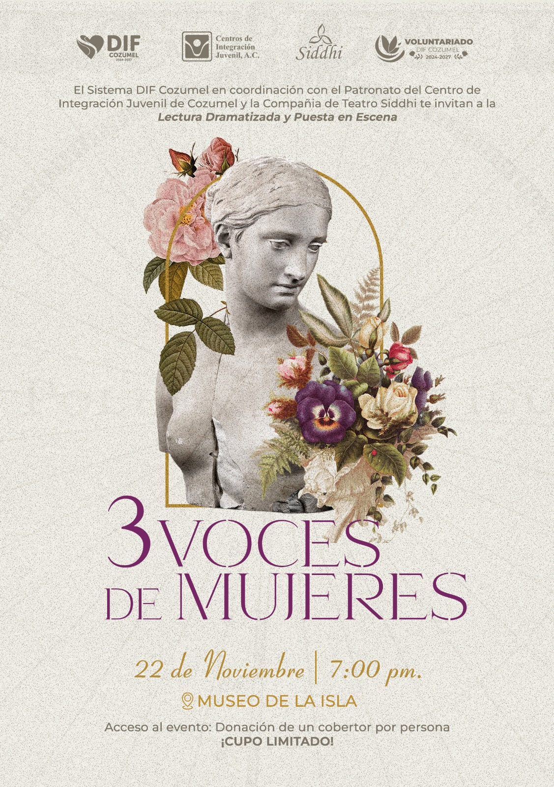 Cozumel, Quintana Roo, a 18 de noviembre de 2025.— La Presidenta Honoraria del Sistema para el Desarrollo Integral de la Familia (DIF) Cozumel, Diana Sosa Blanco, y el Presidente Municipal José Luis Chacón, en coordinación con el Patronato del Centro de Integración Juvenil A.C. y la Compañía de Teatro Siddhi, extienden una cordial invitación a las mujeres de Cozumel para asistir al evento cultural “3 VOCES DE MUJERES”.
