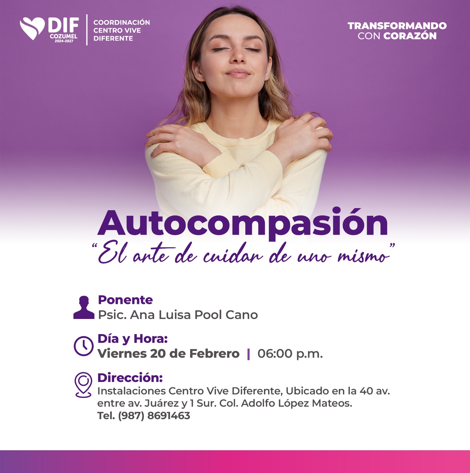 Cozumel Quintana Roo a 19 de febrero de 2026 — El Sistema DIF Cozumel, encabezado por su Presidenta Honoraria, Diana Sosa Blanco, invita a la ciudadanía a participar en la plática “Autocompasión: El arte de cuidar de uno mismo”, la cual se llevará a cabo este viernes 20 de febrero.
